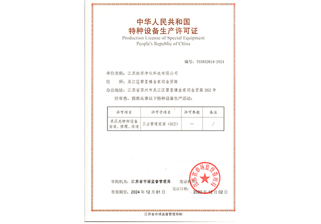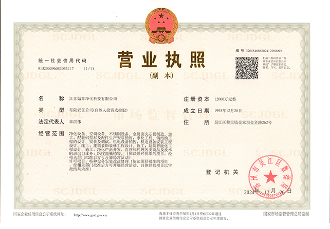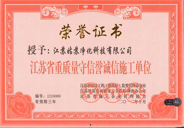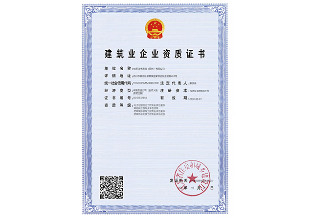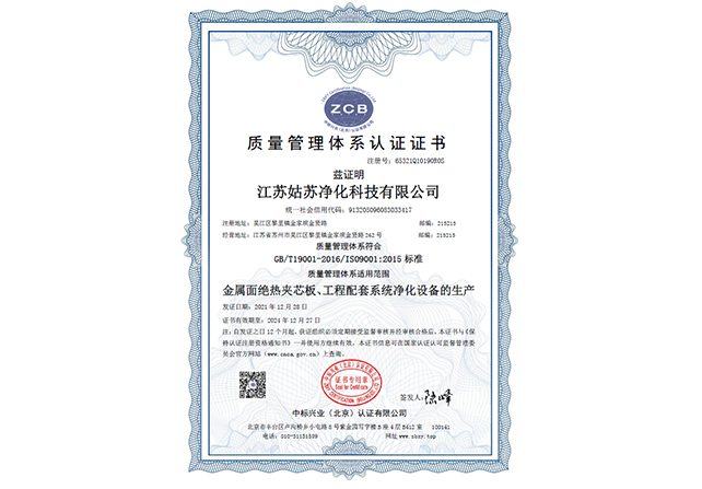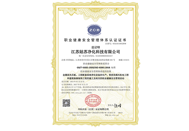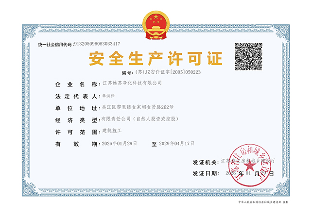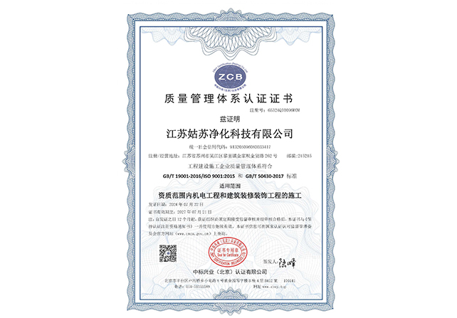 江蘇姑蘇凈化科技有限公司,具有國家電子與智能化工程壹級資質,國家機電安裝工程壹級資質,國家建筑裝修裝飾工程壹級資質 姑蘇凈化科技有限公司,具有國家機電工程施工總承包貳級、國家空氣凈化工程二級資質,國家電子與智能化工程二級資質,國家機電安裝工程二級資質,國家建筑裝修裝飾工程二級資質,消防設施工程專業二級資質企業。